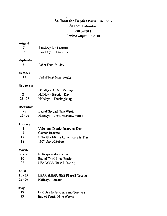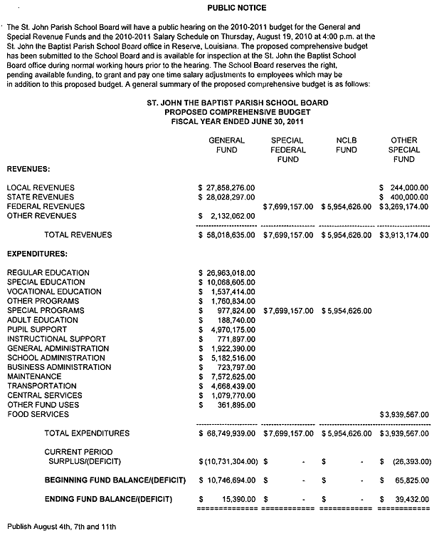 Upon call of the President, the St. John the Baptist Parish School Board will meet in regular session at Godchaux Grammar Cafeteria, 1600 Highway 44, Reserve, Louisiana, on Thursday, August 19, 2010, at 6:00 p.m.