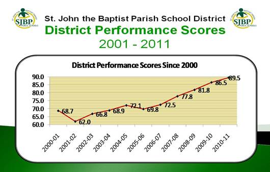 St. John’s District Performance Score, which achieved a 3-point growth this year, is an 89.5 - just ½ point away from earning the rating of ”r;C”. We have come so far as a district. St. John has improved 27.5 points since 2001. We have earned steady and sustainable yearly gains as you can clearly see in the chart at your place.