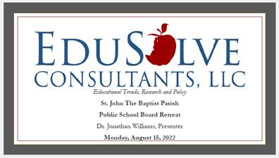 A video conference call was held with Dina Hasiotis (Attuned Partners) regarding St. John Schools joining the Cohort 3 of Strong School Systems, who shared the strategic planning partnership and discussed the Board’s role in this process. The process begins at the end of this month, and by being part of the LDOE Cohort, there will be several meetings for all school systems to participate in. These meetings, which will occur in addition to the meetings facilitated by Javeria with the St. John's team, will occur in the next few weeks.