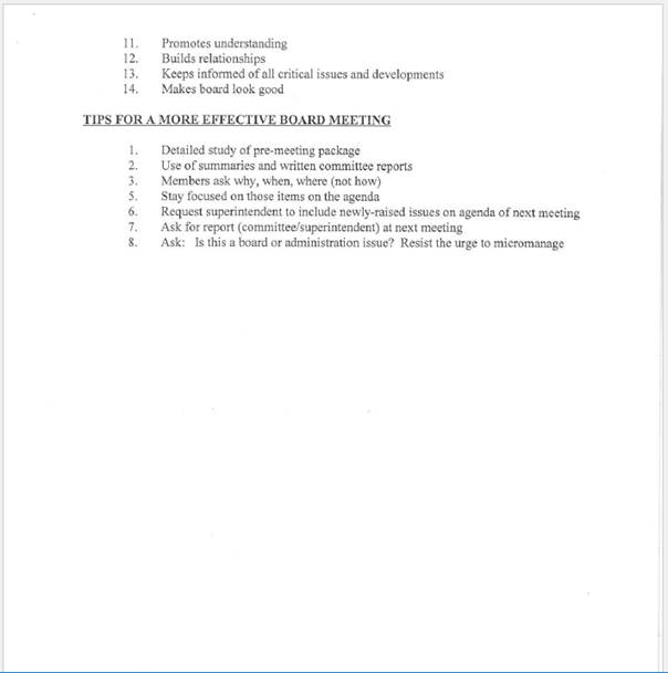 Discussion was held regarding the process of a Superintendent’s Search with Mr. Bob Hammond. He stated that one of the most important things to know is the qualifications of a Superintendent that are important to the Board. He stated that thereare only 3-4 legal requirements for the search. Those are: 1. Must advertise the vacancy on 2 or more occasions, at least 1 week apart in the official journal and once in a major journal with a large subscription); 2. Following the last advertising, a superintendent cannot be selected for at least 30 days (interviews, background checks, reference checks, etc. can all take place during this 30 days); 3. A majority vote of the total membership of the Board is required for selection, which is 6 votes for our district; 4. The superintendnent must receive a written contract.