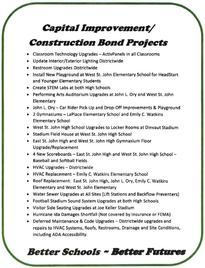 Upon call of the President, the St. John the Baptist Parish School Board will meet for a Board Workshop at Godchaux Grammar Cafeteria, 1600 Highway 44, Reserve, Louisiana, on Thursday, September 28, 2023 at 5:00 p.m.