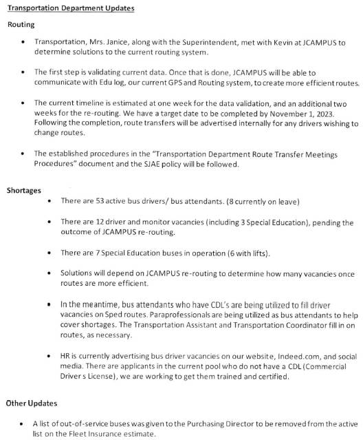 ITEM 8. Public Comment. Mr. Ulysses Jarrow – Update on Transportation/Bus Solutions to Shortages and Routes/Driver & Monitor Vacancies including an Update on the Fleet/Surplus Vehicles