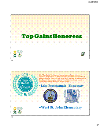 Mrs. Spears recognized West St. John Elementary and Lake Pontchartrain Elementary for earning the LEAP 2025 Top Gains Schools awarded by the State Department of Education, and presented the schools with a banner.