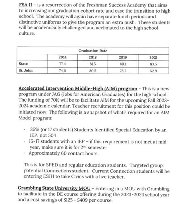 Mrs. Schum began the discussion regarding the possibility of closing Fifth Ward Elementary and redistributing the students, making East St. John Prep a K-8 school again. She also brought up the possibility of consolidating the 2 schools on the west bank into one K-12 school.