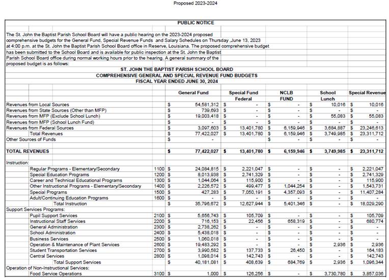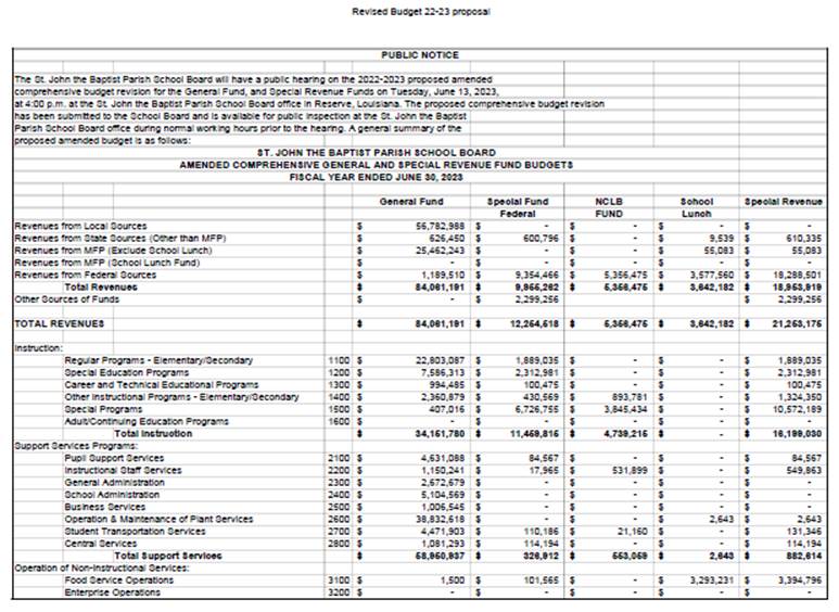 Upon call of the President, the St. John the Baptist Parish School Board will meet in regular session at Godchaux Grammar Cafeteria, 1600 Highway 44, Reserve, Louisiana, on Thursday, June 22, 2023 at 6:00 p.m.
